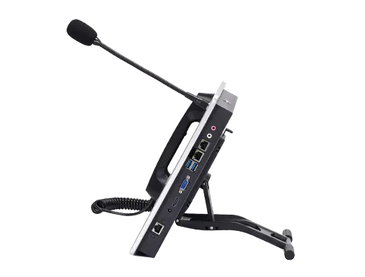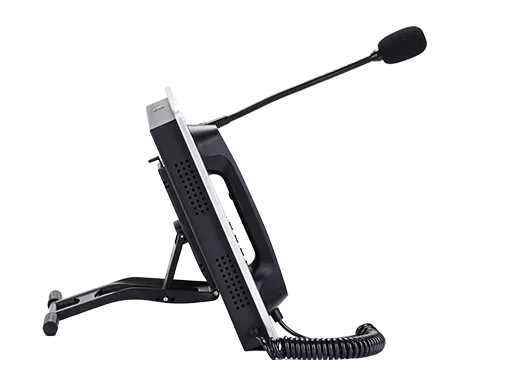 It integrates an industrial-grade SIP telephone with a handset on the left side, together with an industrial keyboard supporting 4 application shortcut keys. On the right side, it is equipped with a 15.6-inch touch screen and a built-in gooseneck microphone. It is a unique product in the industry.